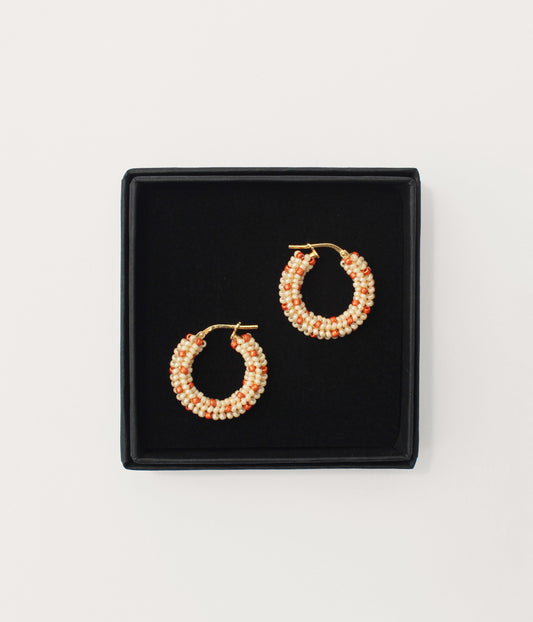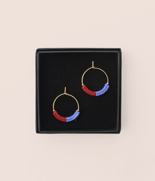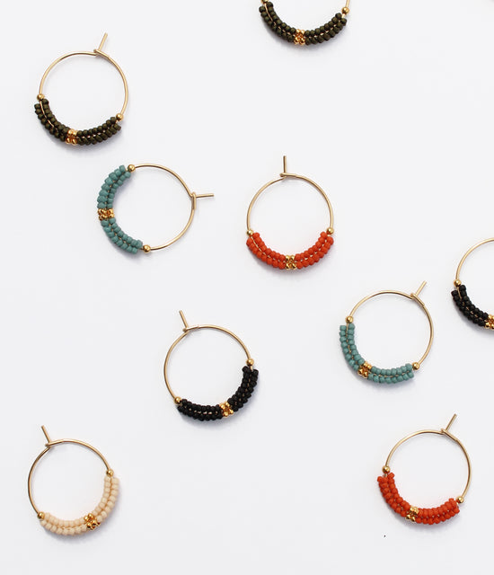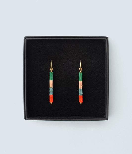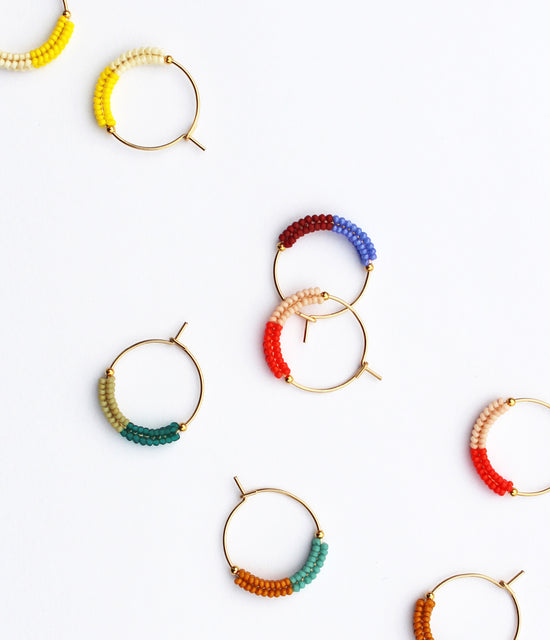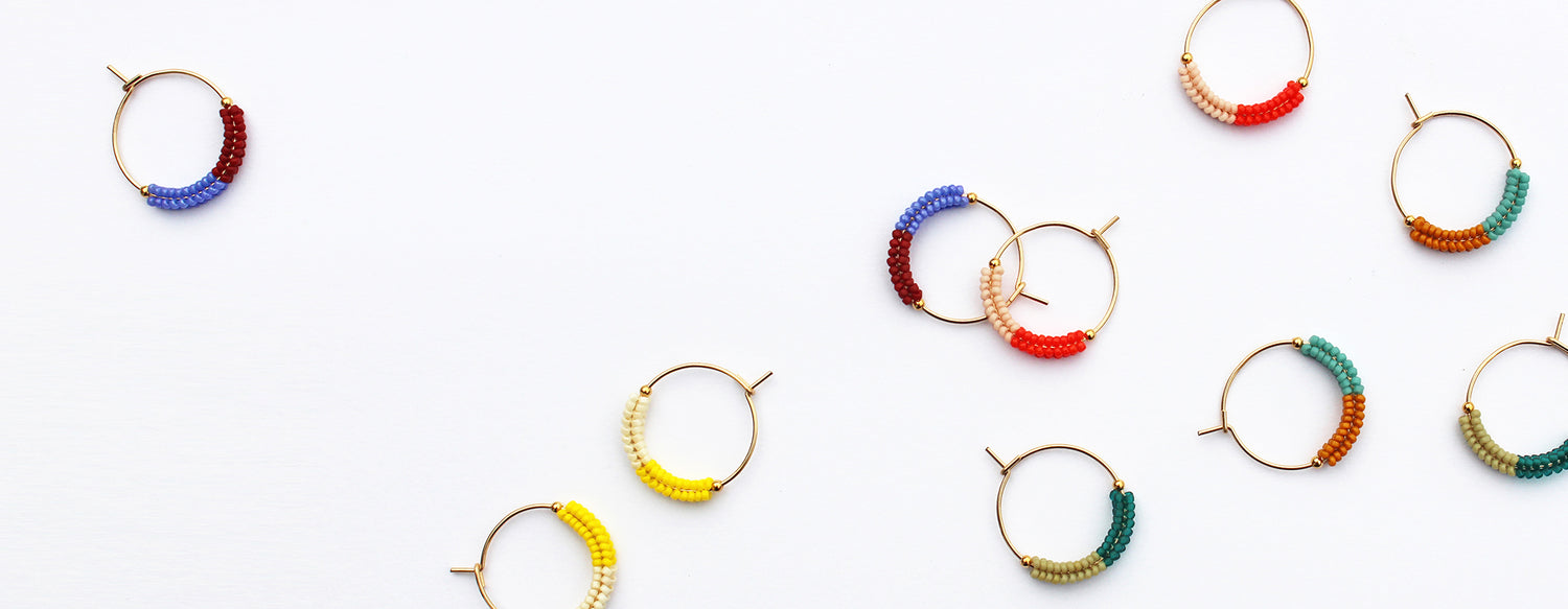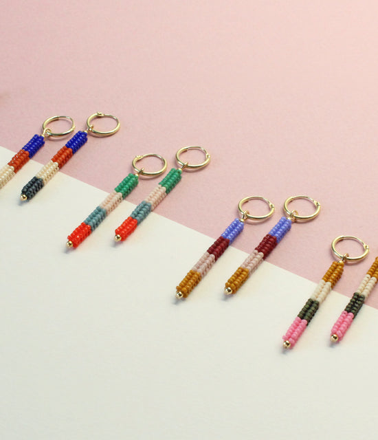 We work with high quality glass beads, measuring less than 2 mm in diameter each. With needle and thread the beads are handwoven into bold and delicate earrings.