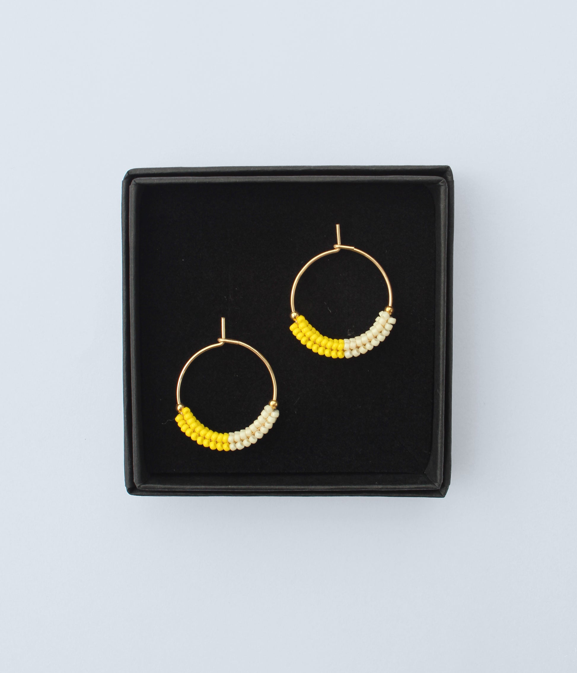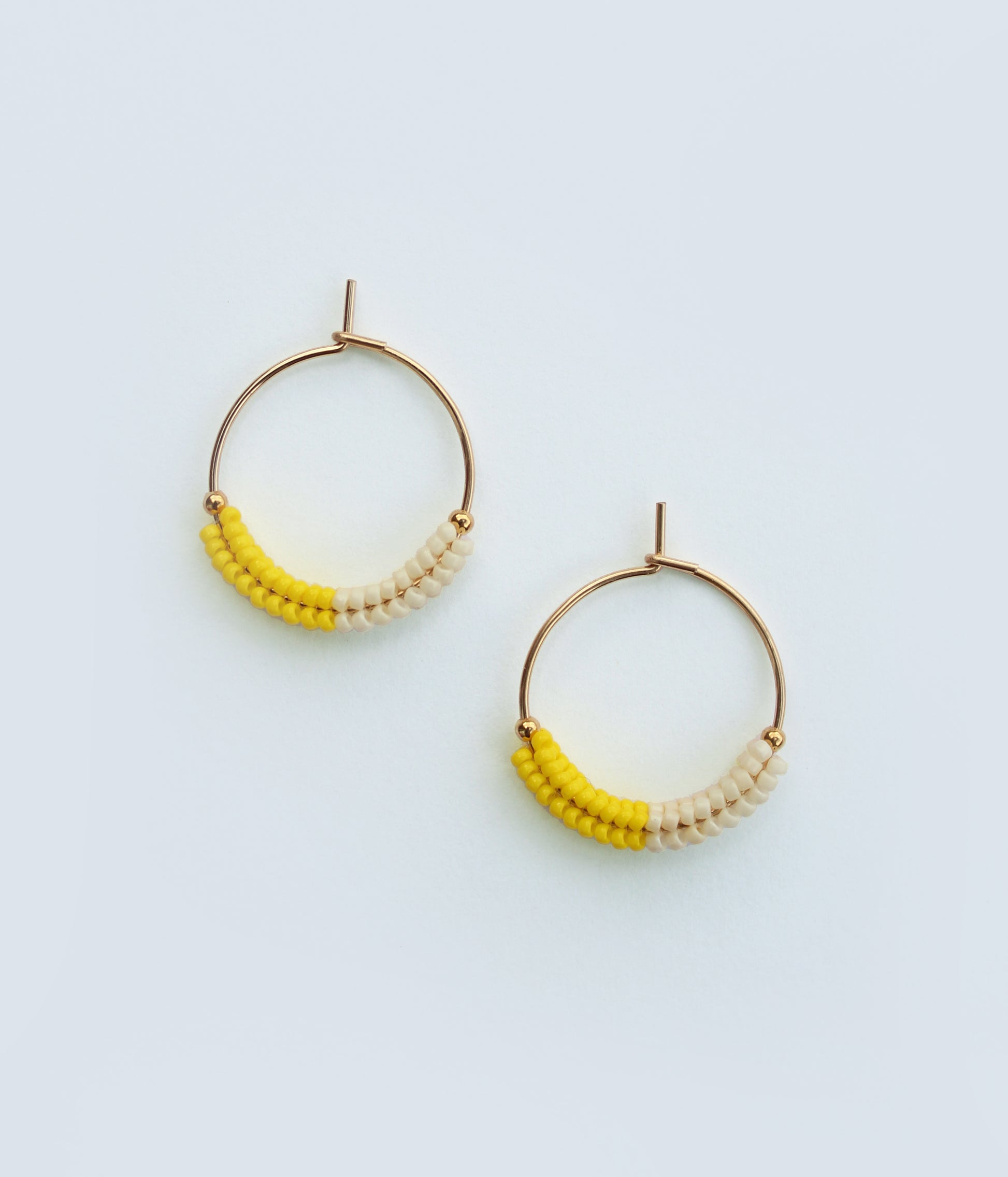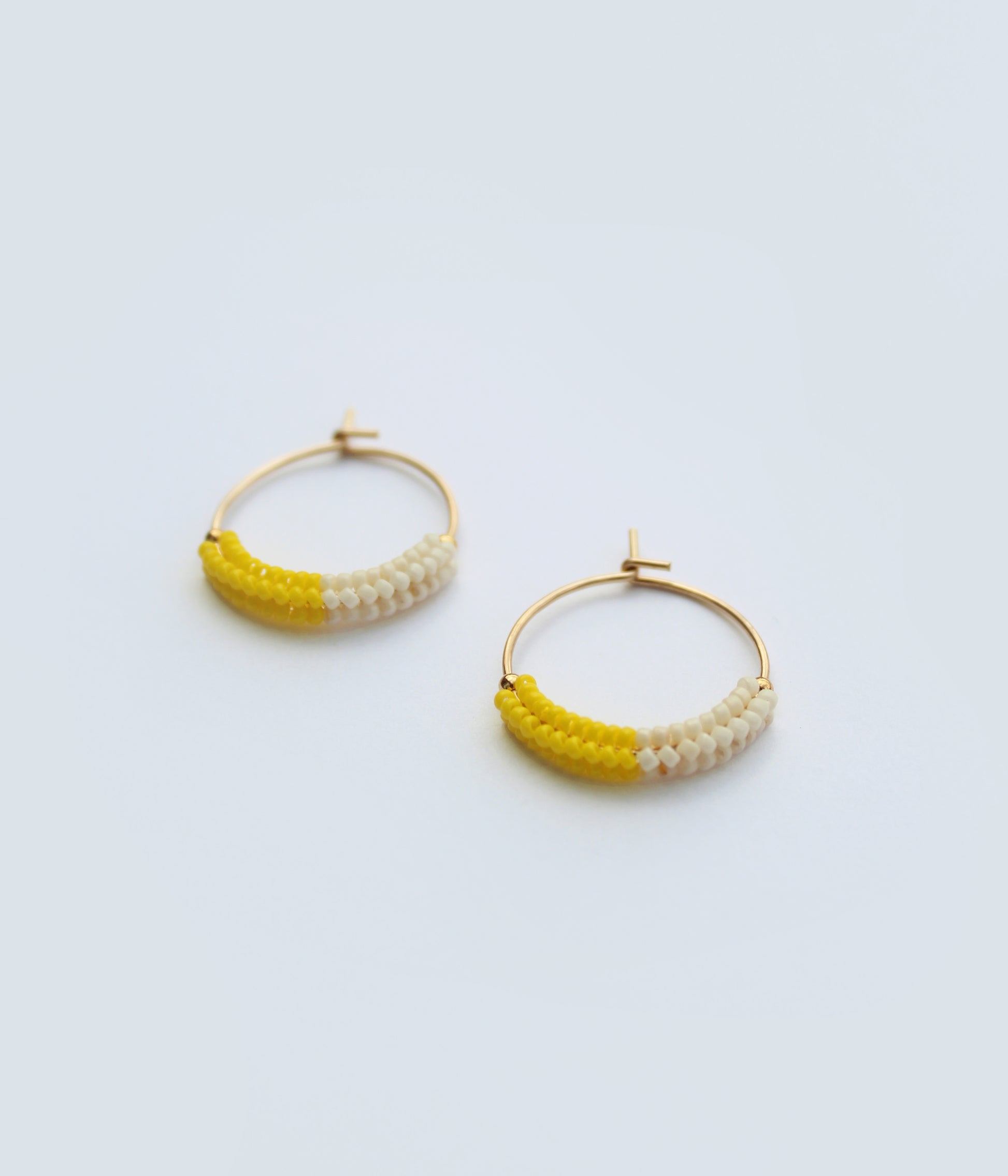 Two tone beadwork in lemon yellow and off white on gold filled 20 mm hoops. Delicate and bold.