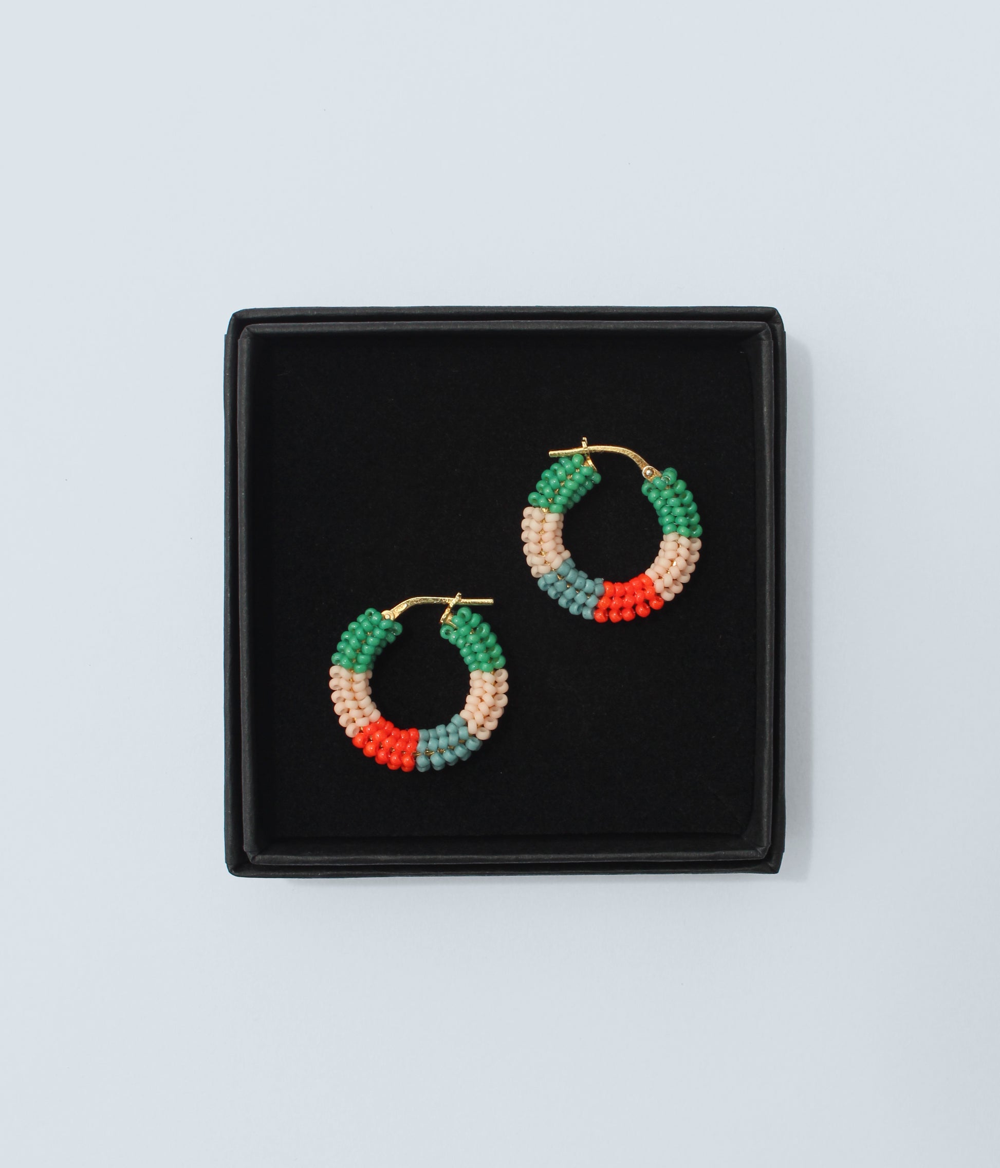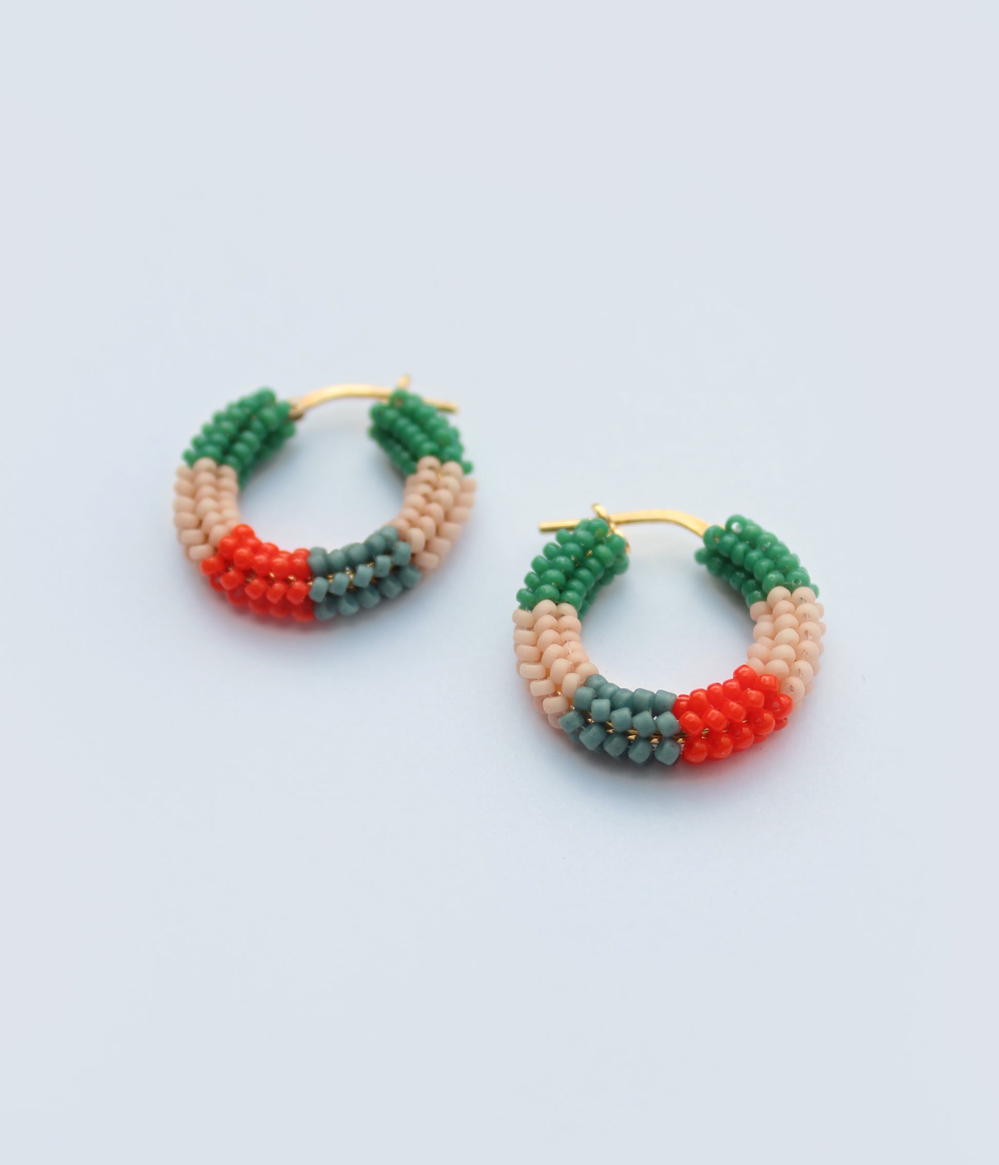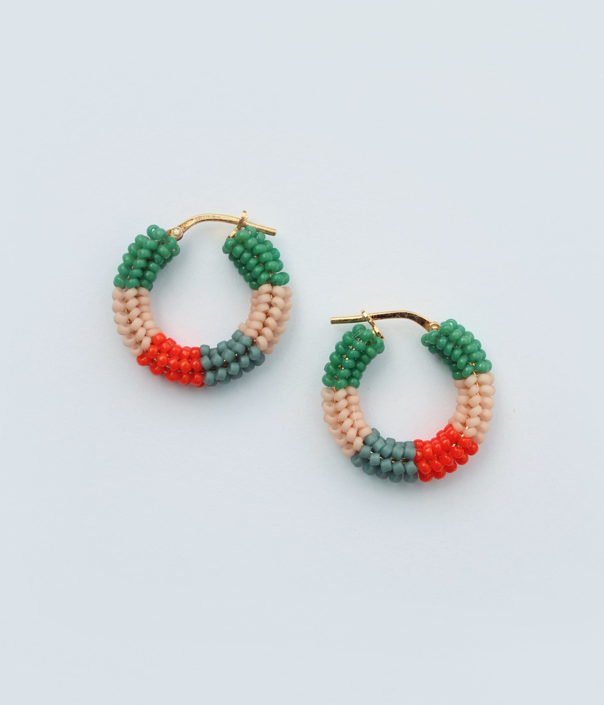 Small creole earrings with a color block beadwork in a mixture of green, soft pink, orange and blue. Tiny glass beads on a 18 mm gold vermeil hoop.