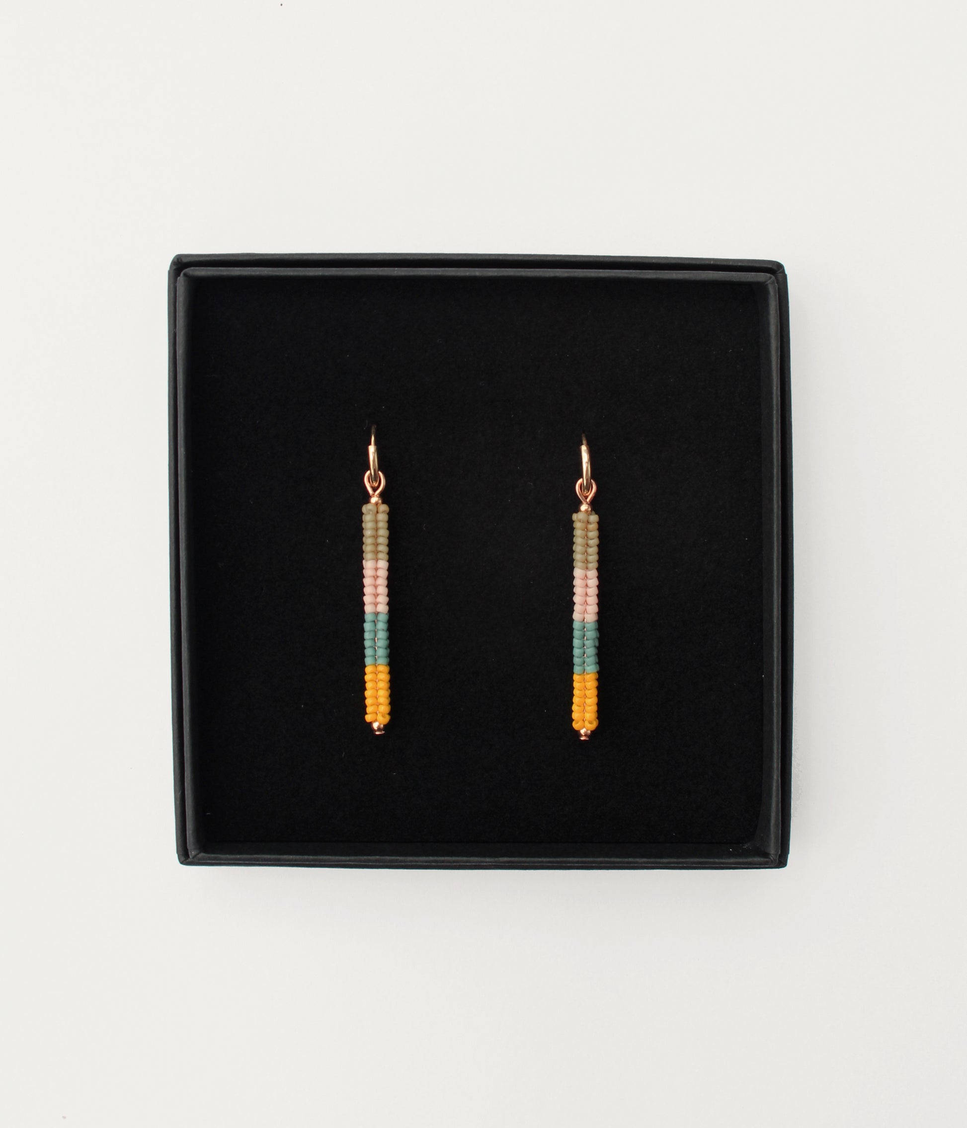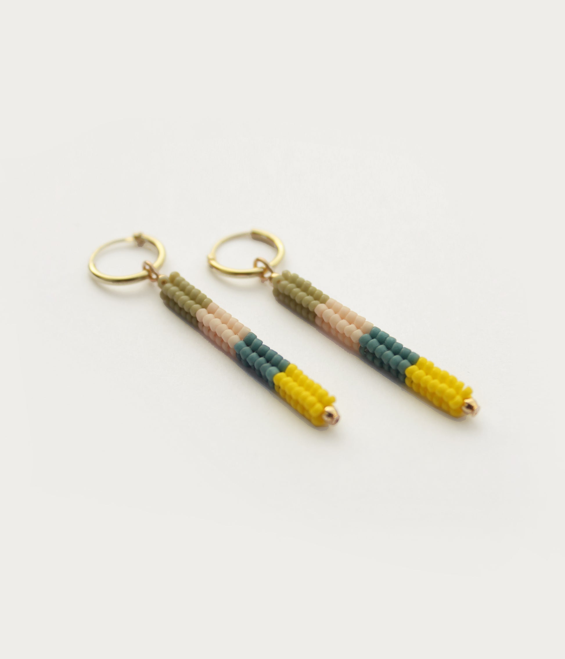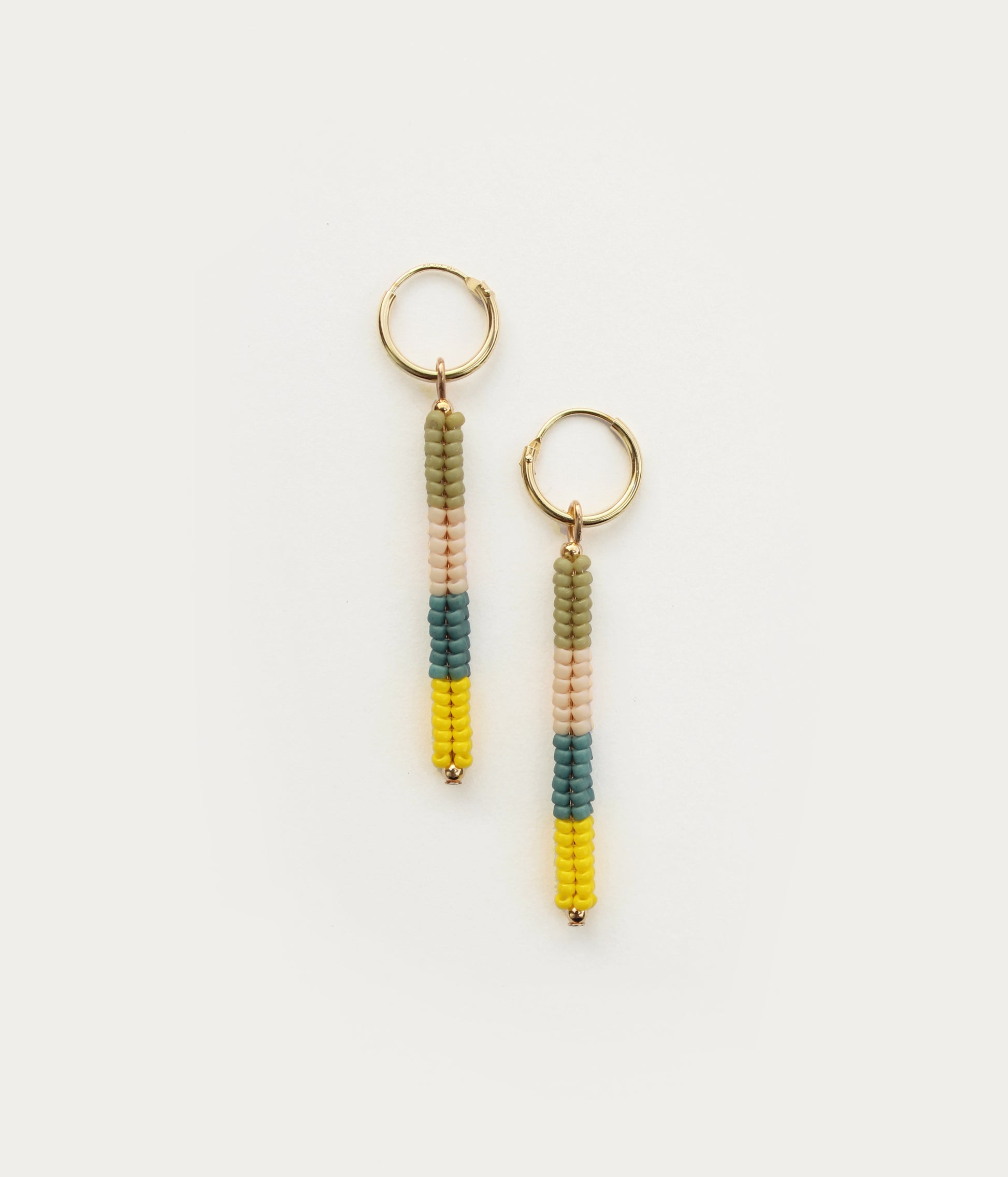 Beaded color block earrings with a mixture of green, ivory, sky blue and lime yellow. Glass seed beads on a gold filled pendant with a 14K solid gold or gold vermeil ring earring.